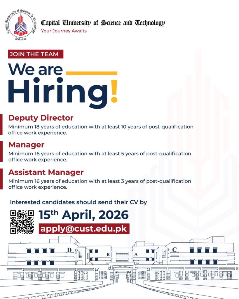 Apply for Capital University of Science and Technology jobs 2026. Check Deputy Director, Manager, and Assistant Manager vacancies, eligibility, experience, and deadline.