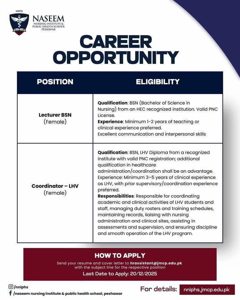 “Join Naseem Nursing Institute & Public Health School! We are hiring for Lecturer BSN (Female) and LHV Coordinator (Female) positions. Apply by 20th December 2025. Explore these career opportunities in Peshawar!”