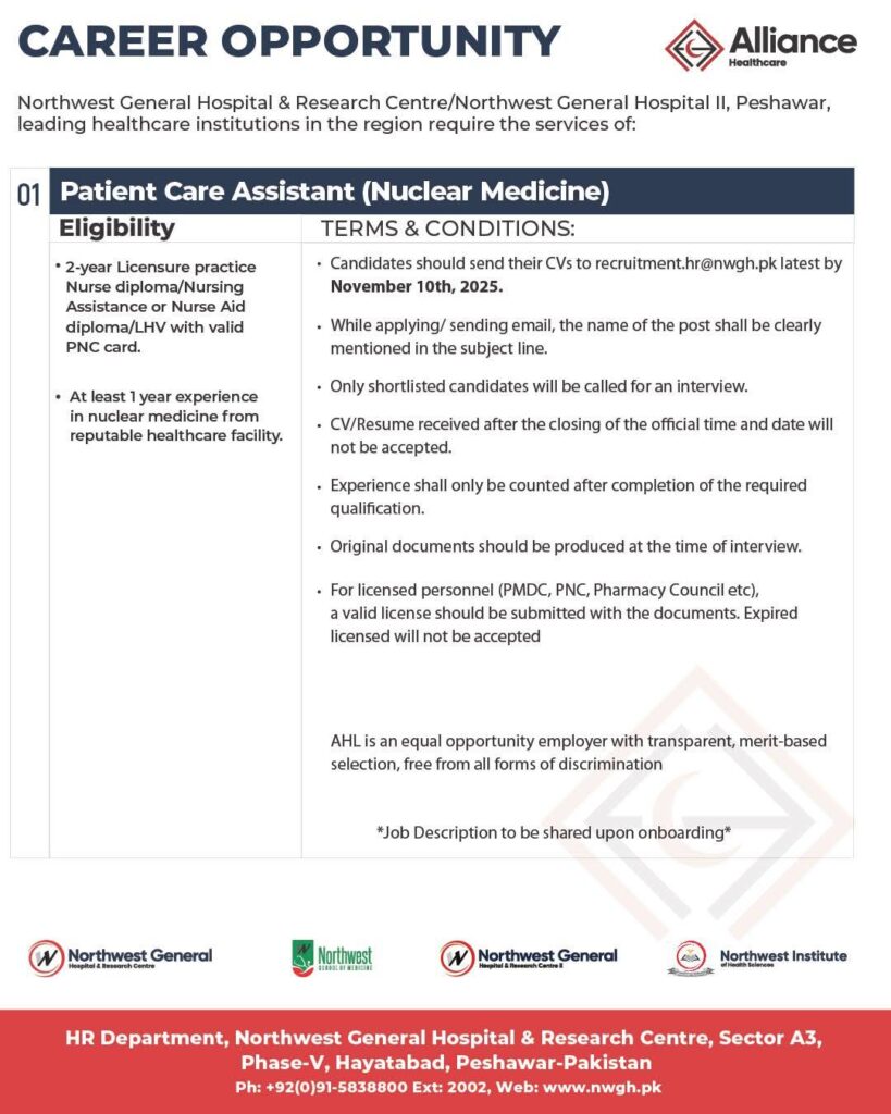 | Patient Care Assistant (Nuclear Medicine) | 2-year Licensure practice Nurse diploma/Nursing Assistance or LHV/Nurse Aid diploma with valid PNC card. | November 10th, 2025 | recruitment.hr@nwgh.pk | At least 1 year in nuclear medicine from a reputable healthcare facility. | Valid professional license (PMDC, PNC, etc.) required; expired license not accepted. |