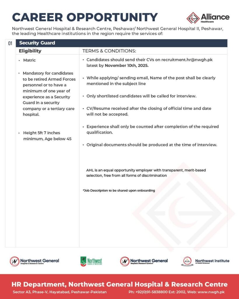 | Security Guard | Matric; retired Armed Forces personnel preferred or 1-year experience as Security Guard. Height: 5ft 7in (min), Age: below 45. | November 10th, 2025 | recruitment.hr@nwgh.pk | 1 year (minimum) | Must clearly mention post name in email subject. Only shortlisted candidates will be called for interview. |