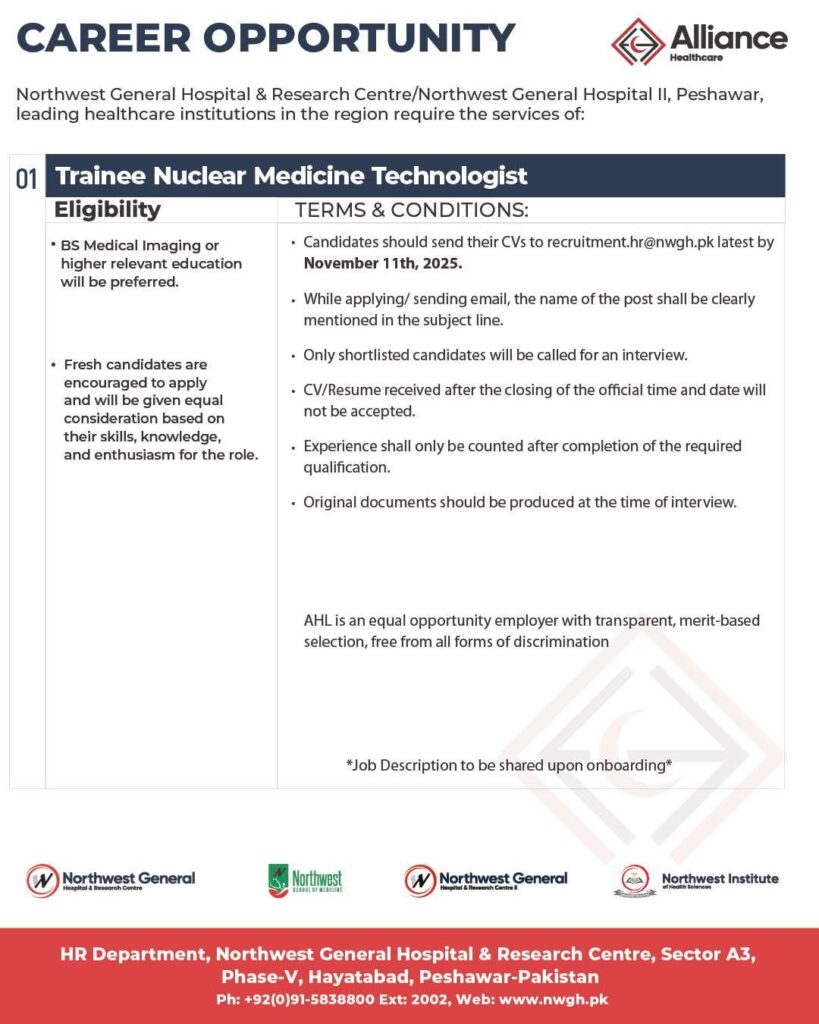 | Trainee Nuclear Medicine Technologist | BS in Medical Imaging or higher relevant education (fresh candidates encouraged). | November 11th, 2025 | recruitment.hr@nwgh.pk | Fresh or minimal experience (considered based on skills & enthusiasm). | Original documents required at interview. Job description shared upon onboarding. |