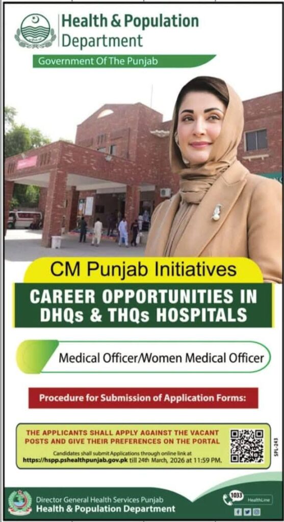 Apply now for the Medical Officer/Women Medical Officer positions in DHQs & THQs hospitals under CM Punjab initiatives. Submit applications online by March 24, 2026.