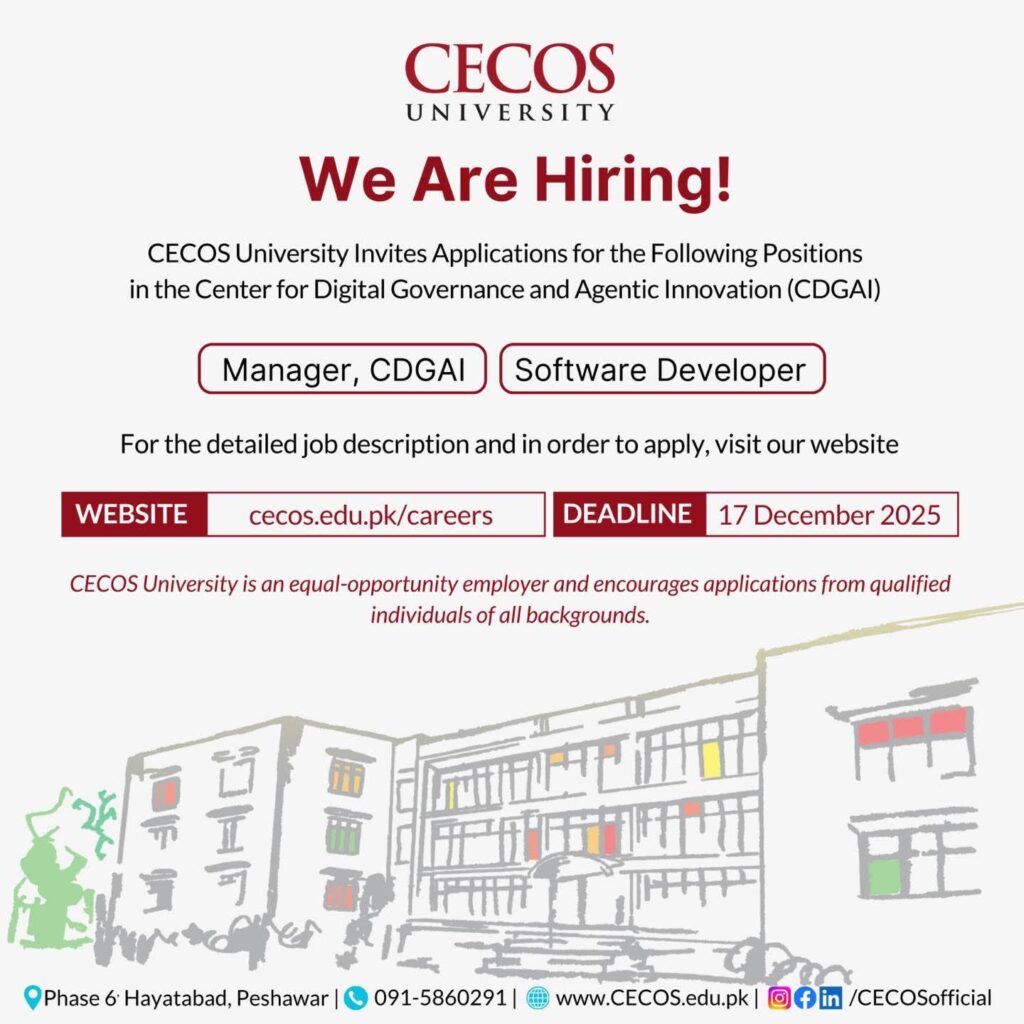 CECOS University invites applications for Manager and Software Developer positions in the Center for Digital Governance and Agentic Innovation (CDGAI). Apply before 17th December 2025 for a chance to contribute to innovative digital projects at a leading educational institution in Peshawar. Visit cecos.edu.pk/careers to apply.