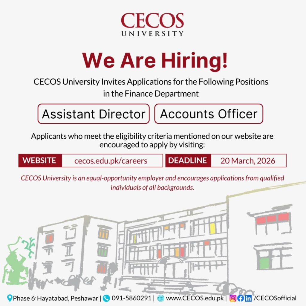 CECOS University Peshawar is inviting applications for Assistant Director and Accounts Officer positions in the Finance Department. Qualified candidates with finance, accounting, or management backgrounds can apply before 20 March 2026 for these university job opportunities.