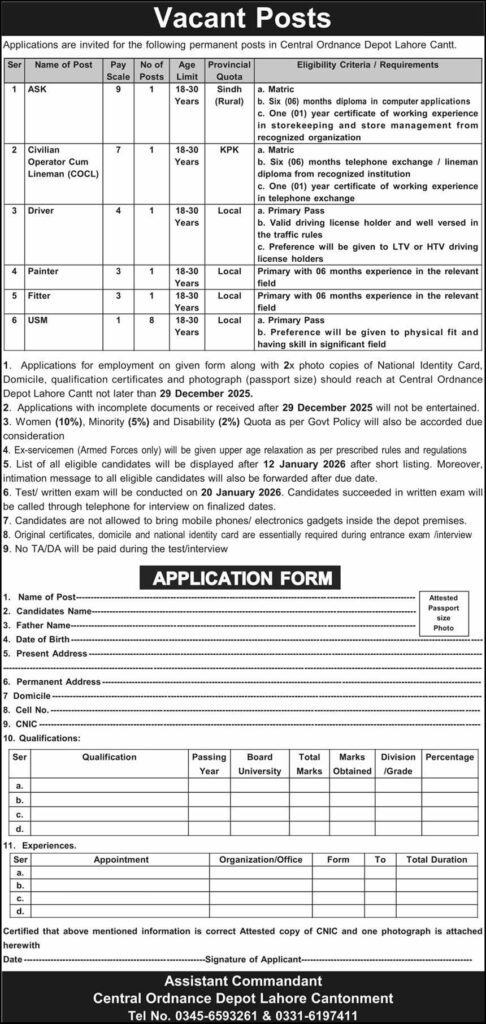 Apply for Central Ordnance Depot Lahore Cantt jobs 2025. Permanent government vacancies announced for ASK, Civilian Operator Cum Lineman, Driver, Painter, Fitter, and USM. Check eligibility, age limit, provincial quota, test schedule, and submit application before 29 December 2025.