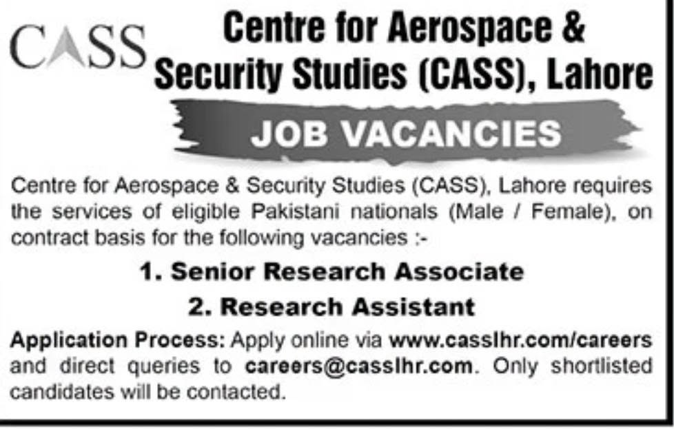 Apply for Centre for Aerospace & Security Studies jobs 2026 including Senior Research Associate and Research Assistant positions in Lahore. Check eligibility, application process, and career details for Pakistani nationals.