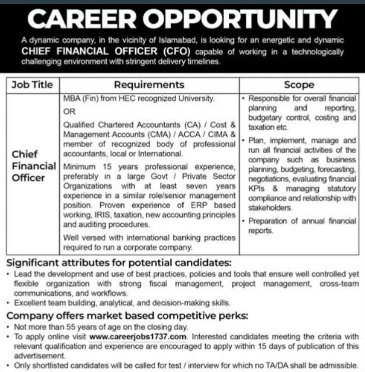Apply for Chief Financial Officer (CFO) job near Islamabad 2026. Explore eligibility, qualifications, experience requirements, age limit, and application deadline for finance leadership role.