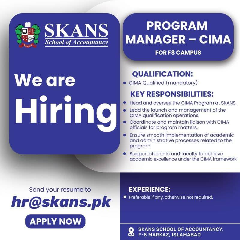 CIMA Qualified? SKANS School of Accountancy, F-8 Islamabad, is hiring a Program Manager to head and oversee their CIMA Program. Lead operations, manage administrative processes, and ensure academic excellence. CIMA qualification is mandatory. Apply now by sending your resume to hr@skans.pk!