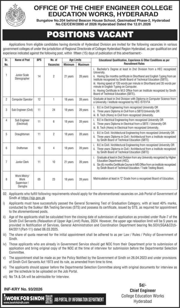 Apply for College Education Works Hyderabad Jobs 2026. Vacancies announced from BPS-01 to BPS-14 including Junior Scale Stenographer, Sub Engineer, Clerk, Driver, Chowkidar, Naib Qasid, and other posts. Sindh domicile required. Apply within 15 days.