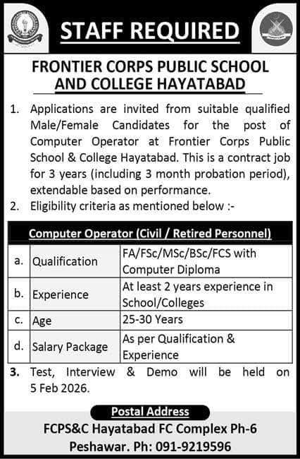 Frontier Corps Public School & College Hayatabad is hiring a Computer Operator. Apply by submitting your application before February 5, 2026.