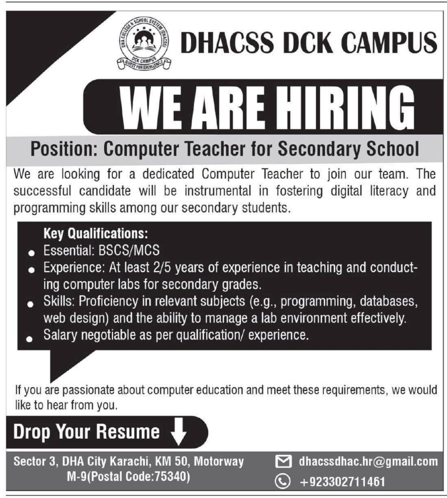 “Join DHACSS DCK Campus as a Computer Teacher for secondary school. Apply now if you have a BSCS/MCS degree and at least 2-5 years of experience in teaching computer science. Competitive salary and opportunity to foster programming skills in students.”