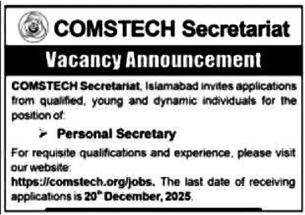 “COMSTECH Secretariat in Islamabad invites applications for the position of Personal Secretary. If you are qualified and dynamic, apply now before the 20th December 2025. Competitive salary and benefits.”