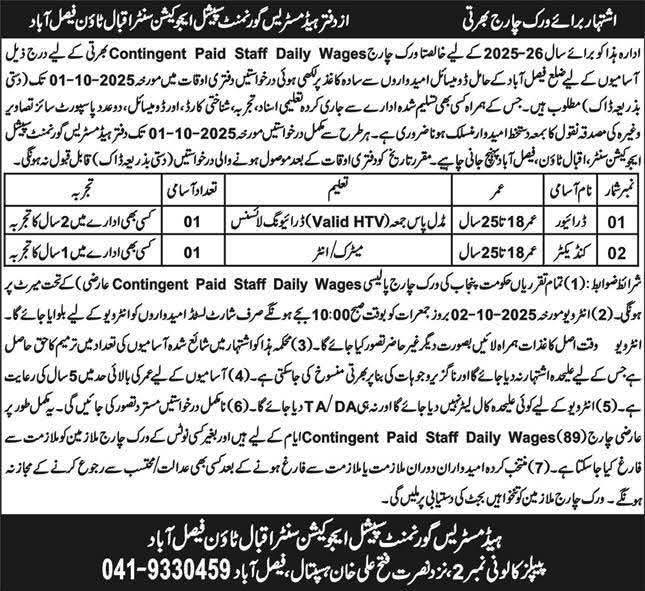 Applications are invited for the following positions on a daily wage basis for the year 2025-26 at Faisalabad. The positions require qualified individuals to join immediately. The last date for submitting applications is 01st October 2025.