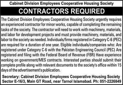 The Cabinet Division Employees Cooperative Housing Society is looking for qualified Contractors to complete various minor works and development projects within the society. The position requires experienced contractors with the ability to handle machinery, materials, and labor, and complete remaining tasks as part of ongoing development. Applicants must be registered under Category C-6 with the Pakistan Engineering Council (PEC) and have experience working with government or MES contracts. Interested candidates should apply by submitting their profiles and relevant documents.