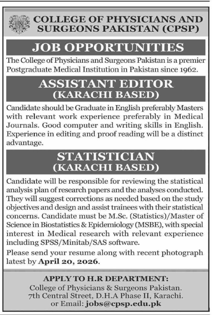 Apply for CPSP Karachi Jobs 2026 for Assistant Editor and Statistician positions. Check qualifications, experience, eligibility criteria, and April 20 deadline for medical institute careers in Pakistan.