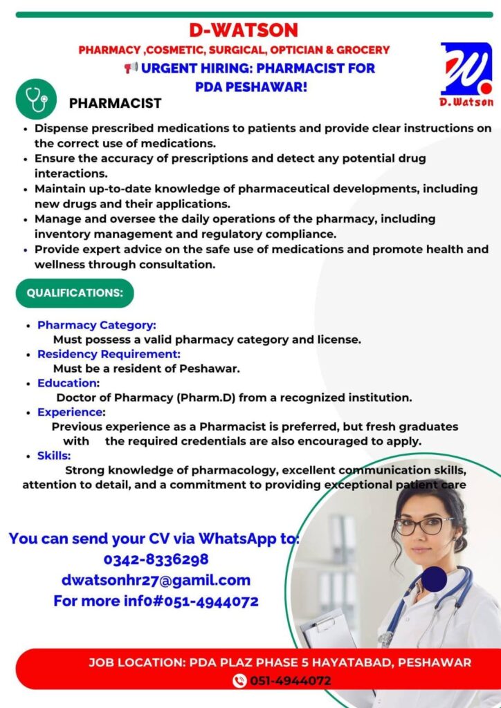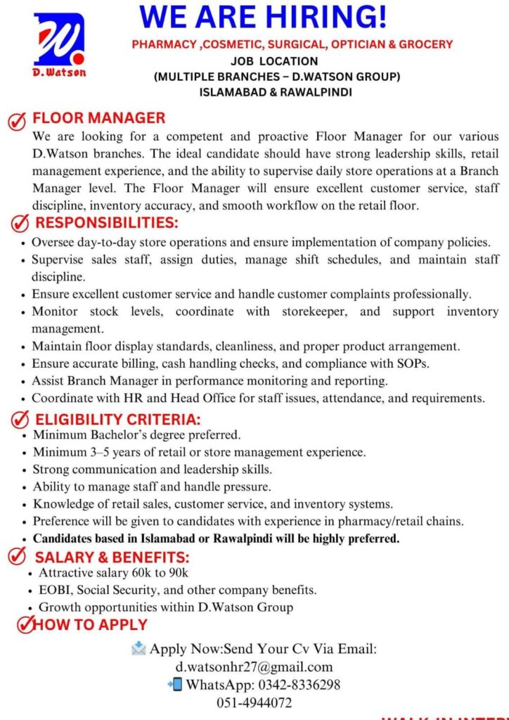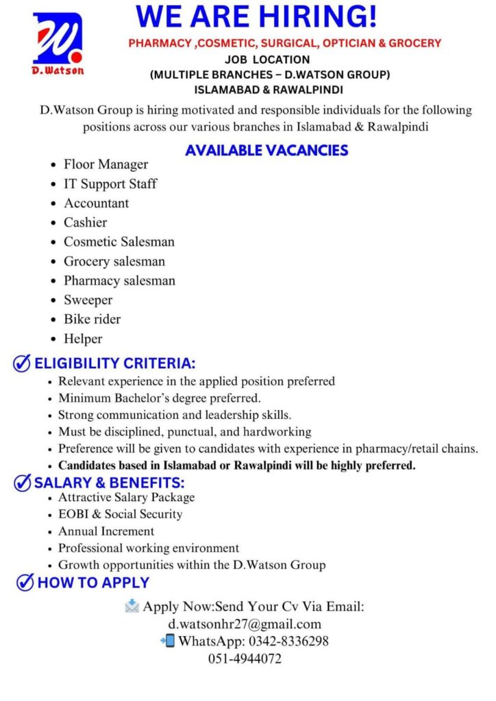 D. Watson Group is hiring Pharmacists, Floor Managers, IT Staff & Salesmen for branches in Islamabad/Rawalpindi & Peshawar. Attractive salary and benefits. Apply now!