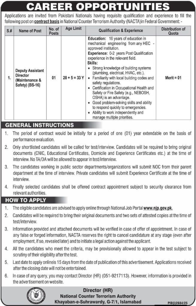 The National Counter Terrorism Authority (NACTA) is hiring a Deputy Assistant Director for the Maintenance & Safety department. Mechanical engineering graduates with 0-2 years of relevant experience are encouraged to apply. The application deadline is 15 days from the advertisement date.