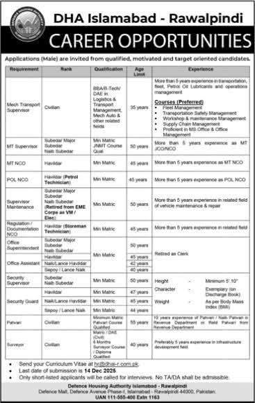 “DHA Islamabad – Rawalpindi is hiring for multiple positions, including Mechanical Transport Supervisor, MT Supervisor, NCO, and Security Guard. Apply by 14th December 2025 for these exciting career opportunities in the defense housing authority.”
