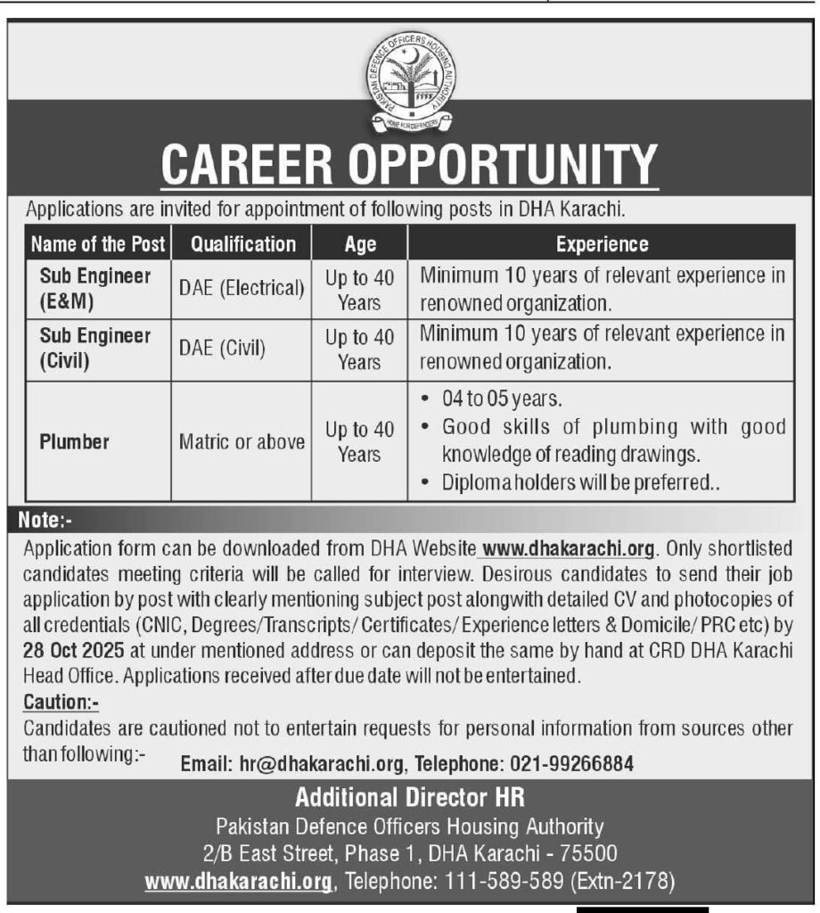 Join DHA Karachi and apply for Sub Engineer (E&M), Sub Engineer (Civil), and Plumber positions. Excellent career opportunity with competitive benefits. Apply by October 28, 2025.