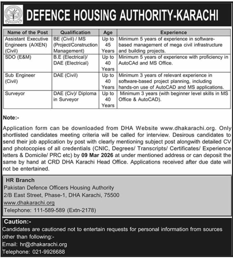 Defence Housing Authority (DHA) Karachi announces civil engineering and technical jobs 2026 for Assistant Executive Engineers (A/XEN), SDO (E&M), Sub Engineer (Civil), and Surveyor. Apply before 09 March 2026 for infrastructure project roles.