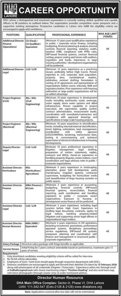 DHA Lahore is hiring for various senior and specialized positions. Apply by February 15, 2026, for roles such as Additional Director Finance, Legal, Project Engineers, Assistant Directors, and more.