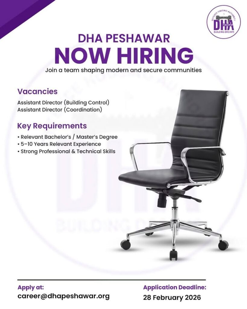 Apply for DHA Peshawar Jobs 2026 for Assistant Director (Building Control) and Assistant Director (Coordination). Check eligibility criteria, required qualifications, experience (5–10 years), application process, and deadline details.
