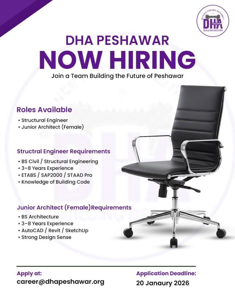 Apply for DHA Peshawar jobs 2026. Vacancies available for Structural Engineer and Junior Architect (Female). Required experience 3–8 years. Last date to apply: 20 January 2026.