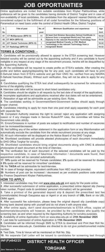 Latest DHO Torghar Jobs 2025 announced for CT Multipurpose, CT MCH, JCT Dental Technician, and CT Radiology posts. Eligible candidates from KPK can apply online through ETEA. View qualifications, age limits, and application procedure. Last date: 11th December 2025.