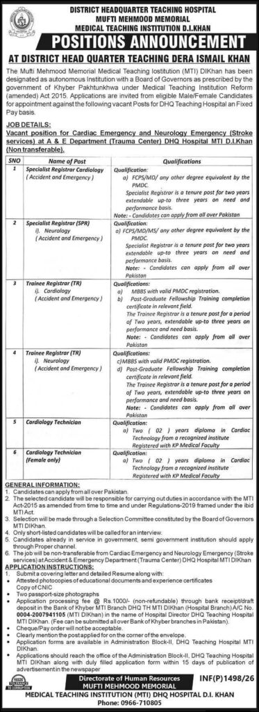 Apply for DHQ Teaching Hospital D.I. Khan Jobs 2026 under MTI. Specialist Registrar, Trainee Registrar, and Cardiology Technician vacancies. Deadline within 15 days. Open to candidates across Pakistan.