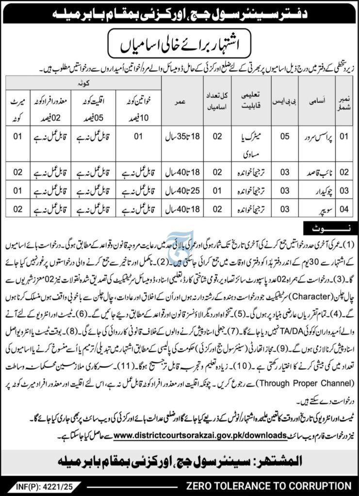 - Application Process: Interested candidates must submit their applications along with the required documents (photocopies of CNIC, educational certificates, experience certificates) to District Courts Orakzai by 30th October 2025.