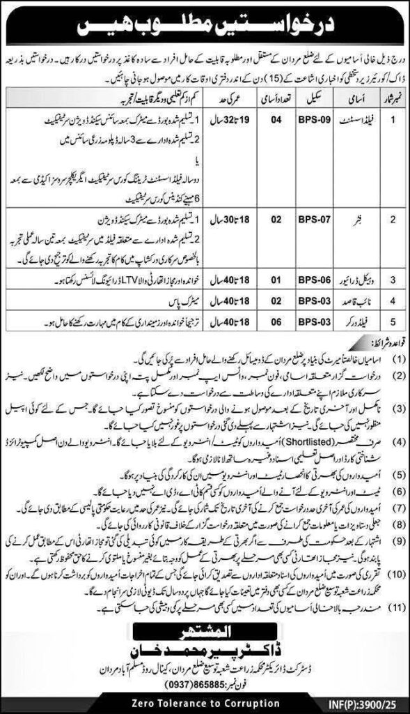Government of Khyber Pakhtunkhwa invites applications for multiple jobs in District Orakzai including Field Assistant, Junior Clerk, Driver, Naib Qasid & Sweeper. Last date to apply is within 15 days. BPS-03 to BPS-09 vacancies. Check eligibility & apply now!