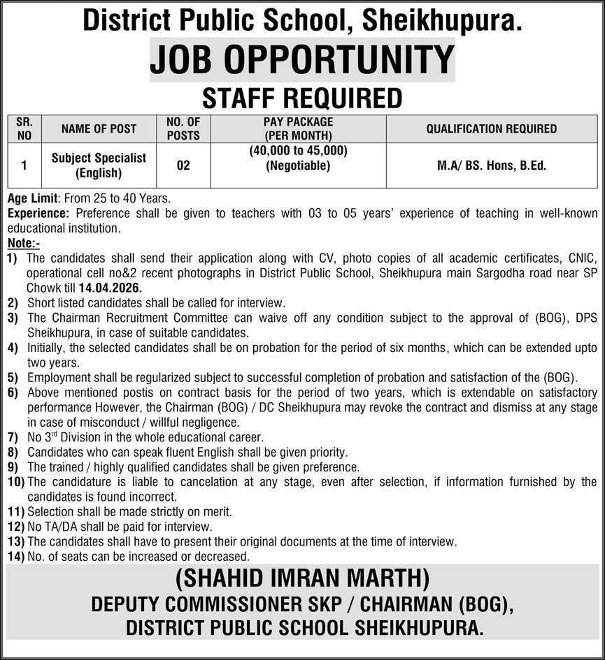 Apply for District Public School Sheikhupura jobs 2026. Subject Specialist vacancies with attractive salary, clear eligibility criteria, and simple application process. Check qualifications, experience, deadline, and details now.