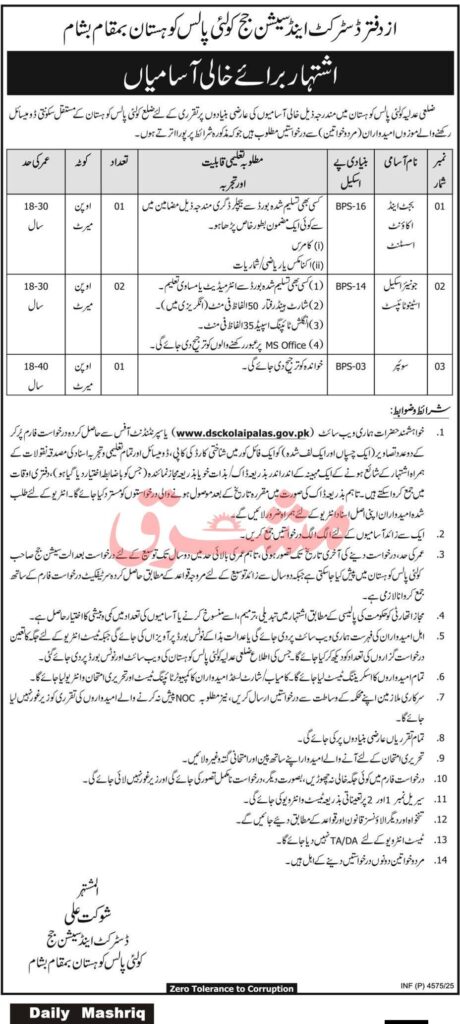 Apply online for District and Session Court Kolai Palas Besham Jobs 2025. Vacancies announced for Assistant, Junior Clerk, and Sweeper. Male and female candidates across Khyber Pakhtunkhwa can apply through www.dsckolaipalas.gov.pk before the deadline. Check eligibility, qualifications, and full details below.