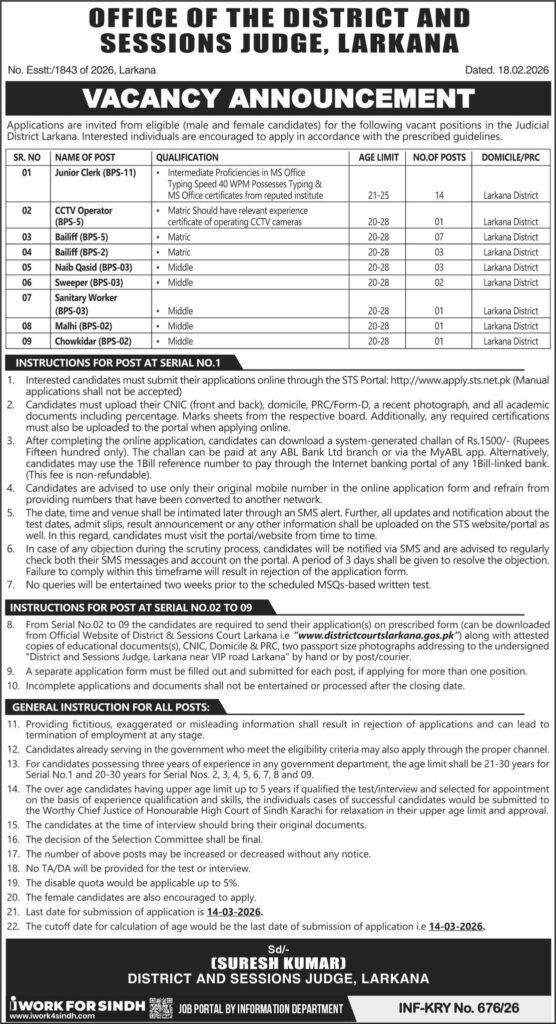 District and Sessions Court Larkana Jobs 2026 announced for Junior Clerk (BPS-11), CCTV Operator, Bailiff, Naib Qasid, Sweeper, and other posts. Check eligibility criteria, age limit, domicile requirement, application process, and last date 14 March 2026.