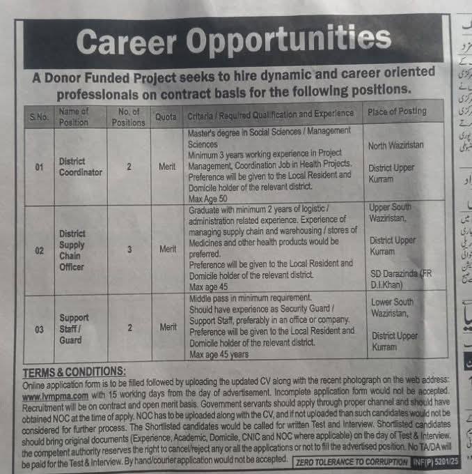 A donor-funded project is hiring for multiple positions, including District Coordinator, District Supply Chain Officer, and Support Staff. The project is based in regions such as North Waziristan, South Waziristan, and District Upper Kurram. Candidates with relevant experience in project management, logistics, or security can apply. Visit official recruitment page for more details and apply before the deadline.
