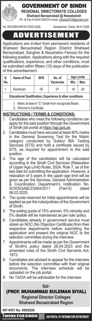 The Government of Sindh invites applications for Electrician posts in Shaheed Benazirabad Region. Apply via Sindh Job Portal before February 12, 2026. Check qualifications, experience, and age limits.