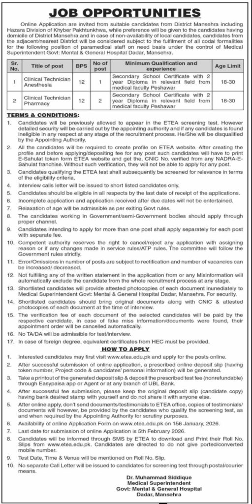 Apply for ETEA Paramedical Jobs 2026 in Mansehra at Govt Mental & General Hospital Dadar. Vacancies for Clinical Technician Anesthesia and Pharmacy (BPS-12). Online applications open January 2026, last date 5 February 2026.