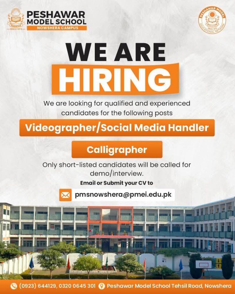 Peshawar Model School Nowshera Campus is hiring qualified and experienced candidates for the following positions. Join a dynamic educational environment and make a difference in students’ lives. Apply today for Videographer/Social Media Handler and Calligrapher roles.