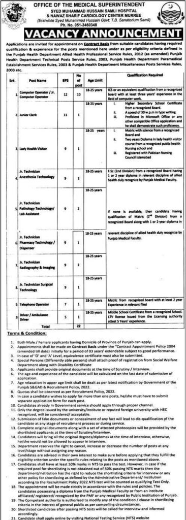 Apply now for contract-based job opportunities at Syed Muhammad Hussain Samli Hospital & Nawaz Sharif Cardiology Center Murree. Positions include Junior Computer Operator, Junior Clerk, Technicians, and more. Check the eligibility criteria, qualifications, and application process to apply before the deadline.