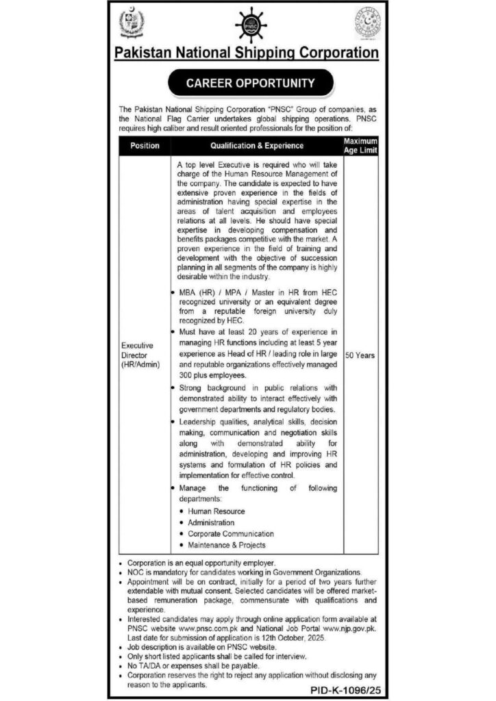Executive Director HR Position at Pakistan National Shipping Corporation – Apply Now for Top Leadership Role