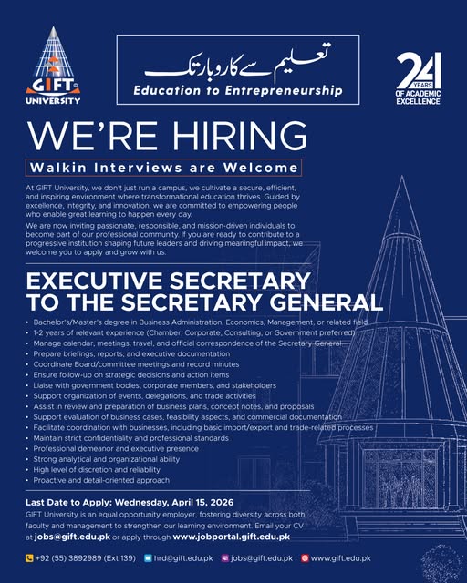 Apply for Executive Secretary to Secretary General job 2026 at GIFT University. Bachelor’s/Master’s degree with 1–2 years experience required. Deadline April 15, 2026.