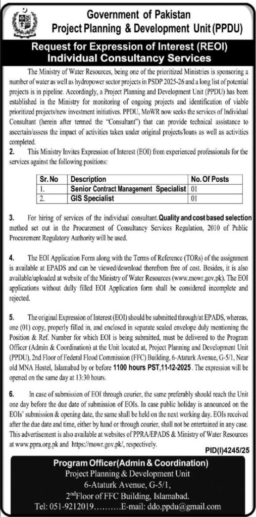 - Location: Project Planning & Development Unit (PPDU), 2nd Floor, Federal Flood Commission (FFC) Building, G-5/1, Islamabad.