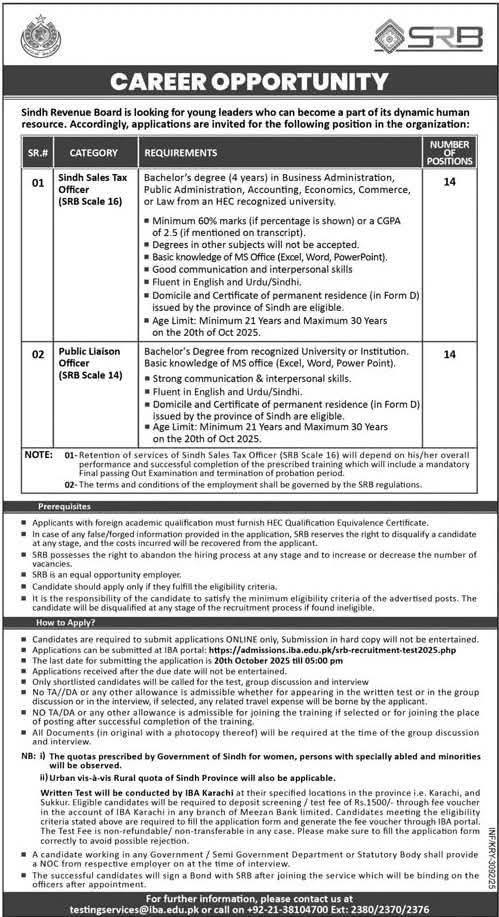 Date 06-10-2025 Sindh Revenue Board (SRB) Job Vacancies Sindh Sales Tax Officer & Public Liaison Officer