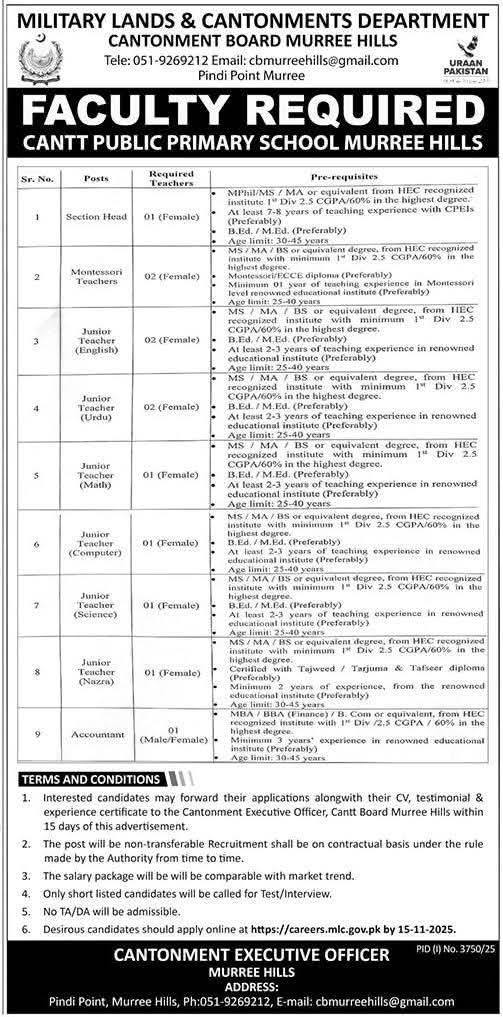 Explore the latest teaching jobs in Murree 2025 at Cantt Public Primary School, Murree Hills. Multiple vacancies for Montessori, English, Urdu, Math, Computer, Science & Nazra teachers and Accountant. Apply online before 15th November 2025 at careers.mlc.gov.pk.