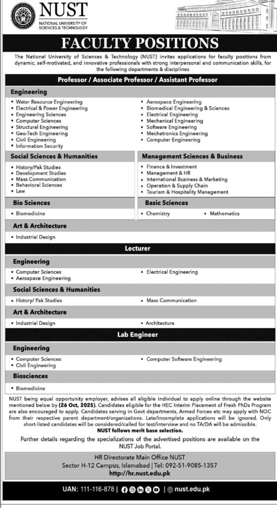 For more details, visit NUST Job Portal or contact HR Directorate at NUST via the provided contact information.