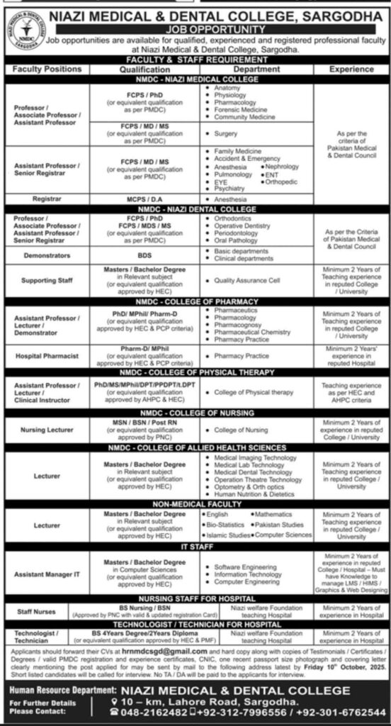 Niazi Medical & Dental College, Sargodha is hiring qualified, experienced, and registered professionals for multiple teaching and non-teaching roles across medical, dental, pharmacy, nursing, allied health sciences, and IT departments. If you are passionate about medical education and healthcare, this is your chance to join a reputable institution.