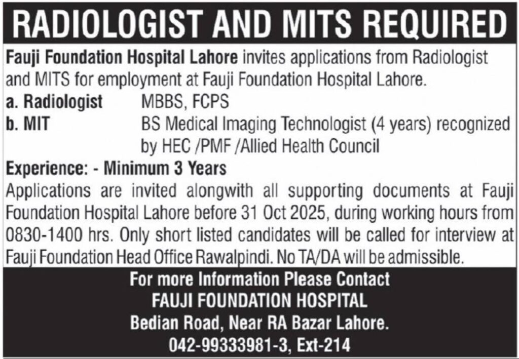 Fauji Foundation Hospital Lahore is hiring Radiologists (MBBS, FCPS) and Medical Imaging Technologists (MIT). Apply by October 31, 2025. Minimum 3 years of experience required