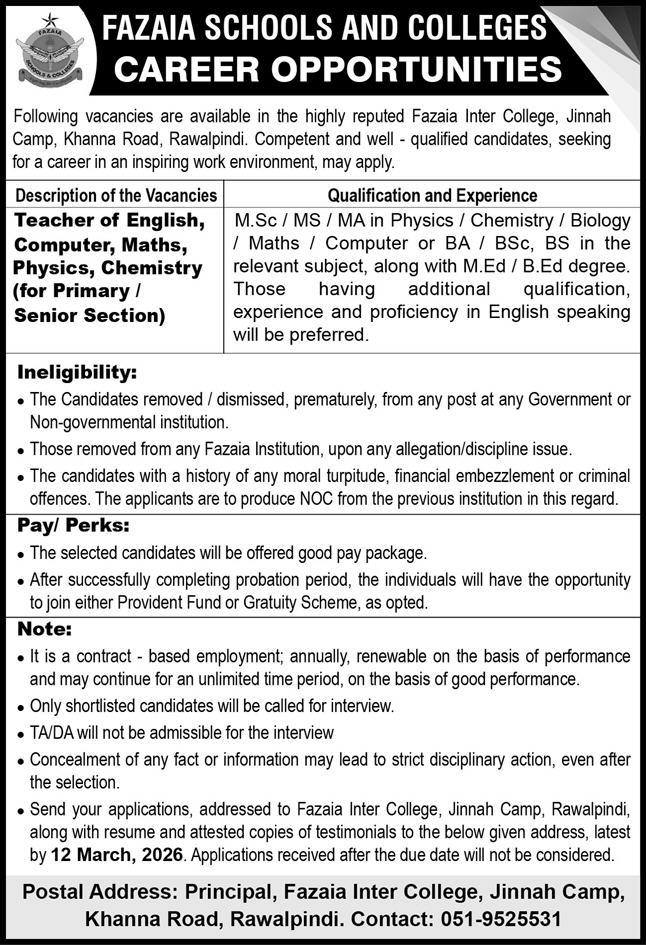 Fazaia Inter College Rawalpindi announces teaching job opportunities for English, Computer, Maths, Physics, Chemistry, and Biology teachers for primary and senior sections. Check qualifications, eligibility criteria, and application details before the deadline.