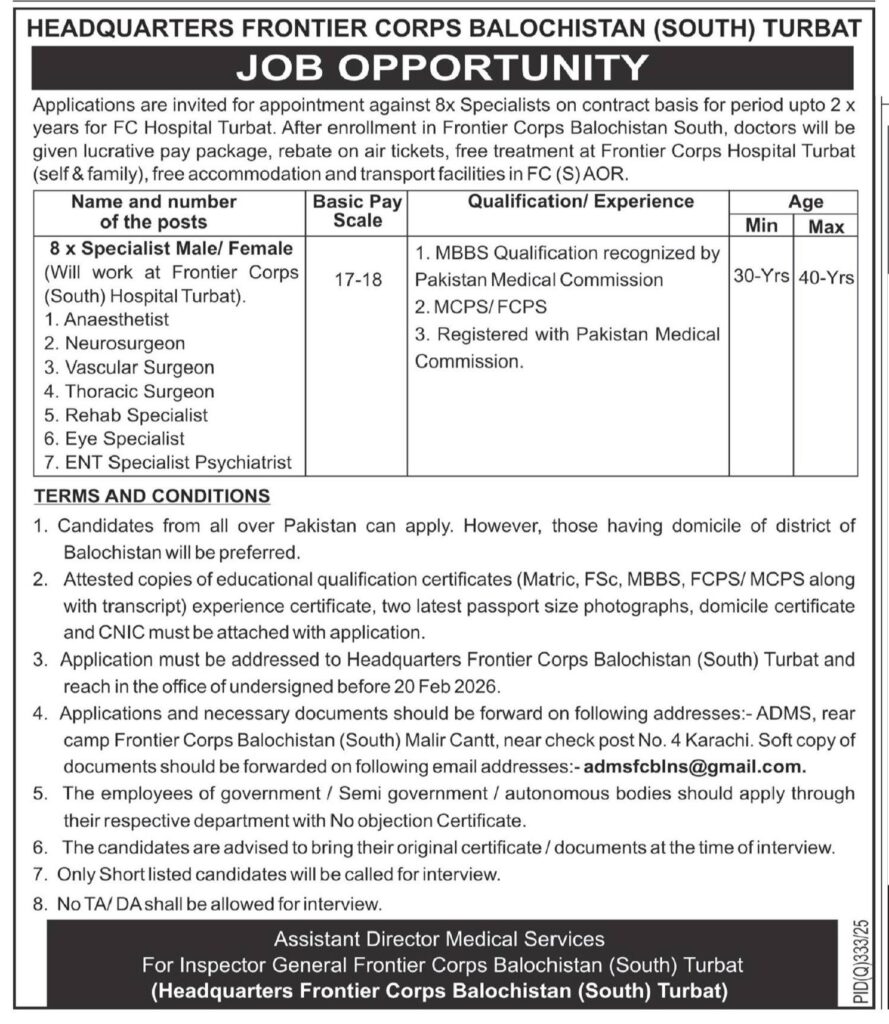 FC Balochistan South invites applications for 8 specialist doctor positions at FC Hospital Turbat. Apply by February 20, 2026, with required qualifications and experience.