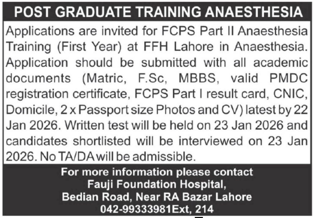 Fauji Foundation Hospital Lahore has announced Post Graduate Training in Anaesthesia (FCPS Part II – First Year). This opportunity is designed for MBBS doctors who have cleared FCPS Part I and are seeking structured postgraduate medical training in anaesthesia at a recognized hospital.